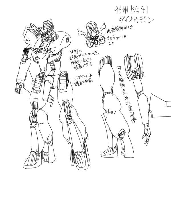 そんで自分の作品を二次創作してくださるのは国道先生です よろしゅうおねがいします。 関係ない話でアレなんですけど、 ロボットものが書きたい。巨大ロボットが。 設定もいくつか作ってみた。 割と近い未来、日本国に小型の隕石群が落下。 国土そのものへの落着のほか、海への落下での津波被害などにより 日本の経済は破綻し、他国からの支援に頼って生きていくことになった。 しかし、支援とは名ばかりに、日本を植民地のように扱う諸国に 激怒した右翼集団が蜂起、クーデターが起こった。 国防産業のすべての力を使い、陸戦兵器ムルムルを用いて世界に対して戦争を仕掛けた。 その名を神州帝国と変えながら。 ムルムルは戦車にかわる二脚型の機動戦闘機械、 自律飛行は不可能だが、この世界における陸戦の王者。 それの上位存在として、神州が開発したものが、 人型の機動兵器、黒鉄(クロガネ)である。 黒鉄の試作機が超限定的な任務で戦場に現れ始め、 連合軍を圧倒、人と同じ手や腕がある機体を、連合軍は「マニピュレーター」と呼称し、 敵の新型とみて調査を開始した。 神州XKM-001護白 主人公機として設定した機体で、 防御能力に特化した機体。 神州の天才科学者により発見された大気中に存在する物質を圧縮して、 粒子化して使用する。余剰の出力を蓄積しバリアとして放出可能。 武装は近接兵装の刀のみ。 神州KG41大王神 雑魚機体として設定した機体。 エース用の大王神は可変する設定なため、 各所に可変機構のためのギミックをつけたけど 雑魚としてはアレなんでオミット。 近接戦機体なので立体的な映像を写せるツインアイを採用したとかなんとか 友達がCGムービー作るっていうから描いたやつの流用。 脚部のつま先とかかとが完全独立したデザインは ∀系統のモビルスーツの影響をうけてます。 しかしロボットモノって難しいんだよね。 このデザイン画をどう崩すかってのがまた。 しかも序盤の主力戦闘兵器のムルムルをデザインしてないんだよね。 人型じゃないからテンションあがらないっつうかなんつうか あと航空兵器もデザインしてないんだよね。 現実から流用するのも未来っつー設定だからどうにもこうにも。 PR
